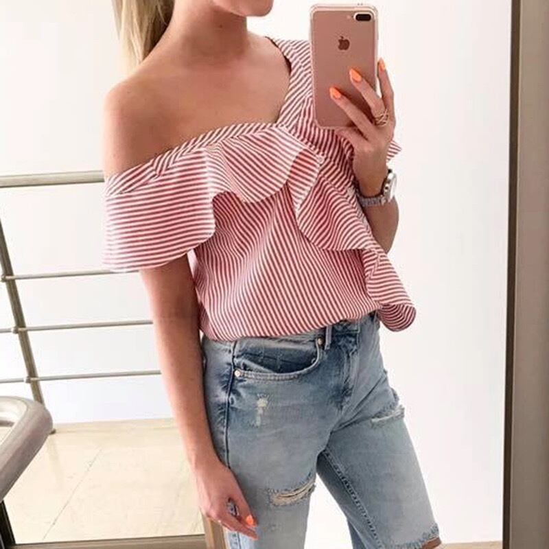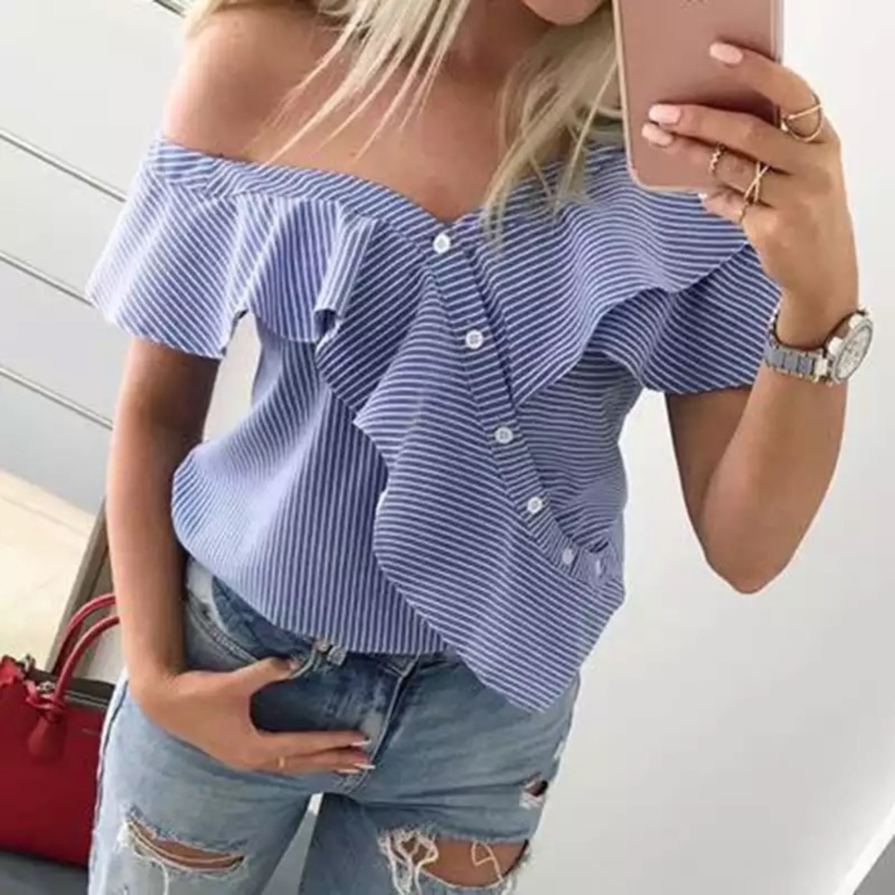 ボタンが可愛い、フリルの付いたストライプオフショルダーです。