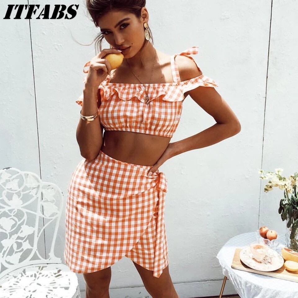 夏 先取り トップス スカート ギンガムチェック セット オフショルダー | kandimart